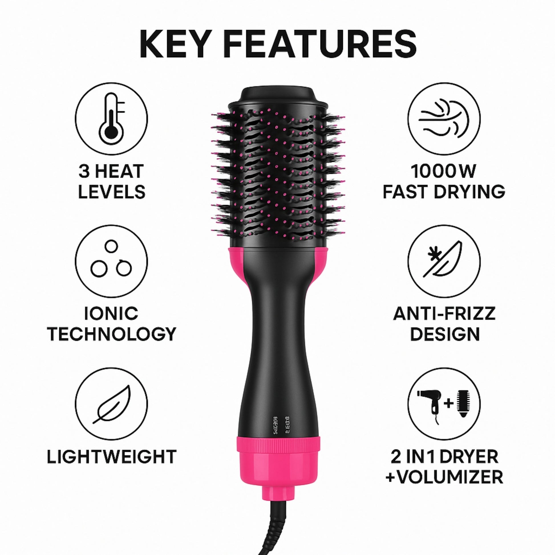 فرشاة تجفيف وتصفيف الشعر 2×1 تمنحك شعرًا ناعمًا، لامعًا، ومصففًا في وقت قياسي دون الحاجة لاستخدام مجفف ومشط منفصلين. تصميم بيضاوي مبتكر يدمج بين قوة الهواء الساخن وتقنية الأيونات لتقليل التطاير ومنح الشعر حجمًا وكثافة طبيعية. مثالية للاستخدام اليومي ومناسبة لجميع أنواع الشعر.